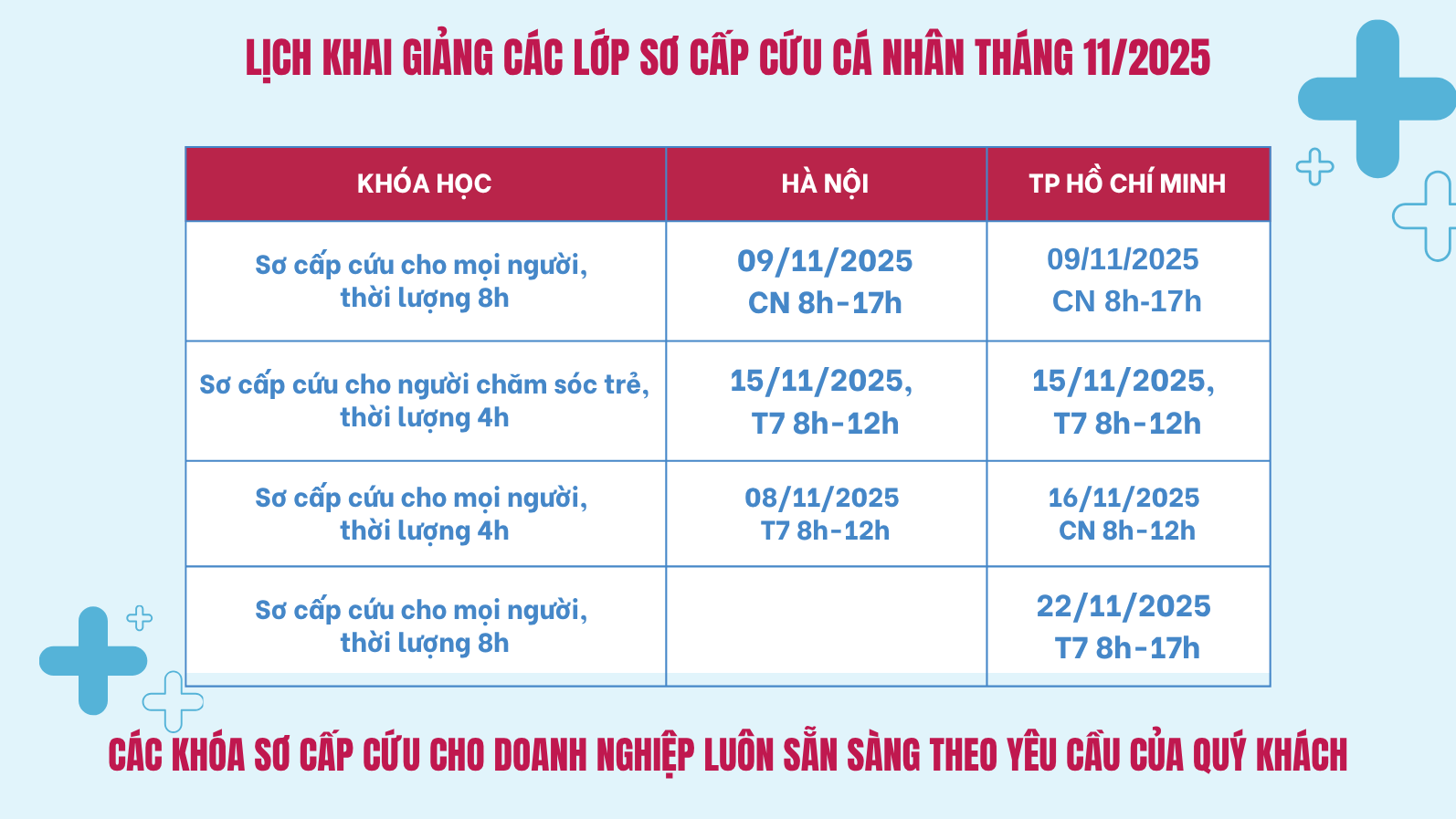 Chúng tôi tổ chức các khóa đào tạo sơ cấp cứu theo chương trình, tiêu chuẩn của AHA cho các cá nhân, doanh nghiệp, trường học có nhu cầu, và các khóa đào tạo hồi sinh tim phổi cho nhân viên y tế theo bản quyền của AHA.
