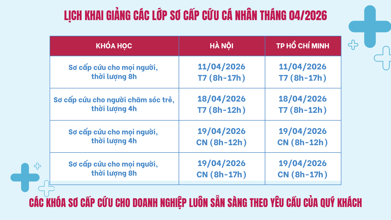 Chúng tôi tổ chức các khóa đào tạo sơ cấp cứu theo chương trình, tiêu chuẩn của AHA cho các cá nhân, doanh nghiệp, trường học có nhu cầu, và các khóa đào tạo hồi sinh tim phổi cho nhân viên y tế theo bản quyền của AHA.
