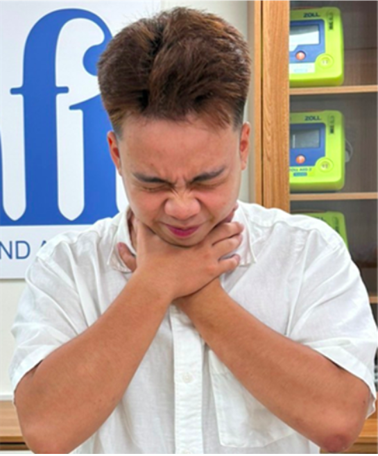 Dấu hiệu bị dị vật đường thở nặng (nạn nhân dùng hai tay ôm cổ).