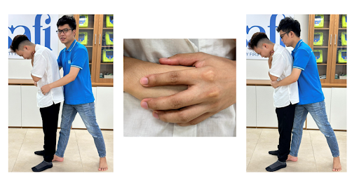 - Đặt nắm đấm vào bụng của nạn nhân tại vị trí trên rốn và dưới mũi ức.